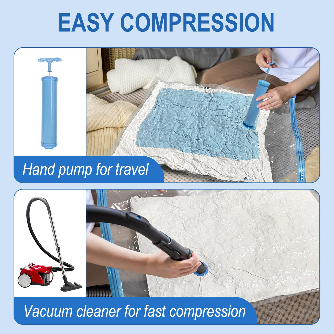 - 【Easy Compression】: The one-way valve can adapt the vacuum cleaner, you can easily suck the air out and get the compression done fast and easy. Also, the package comes with a hand pump which is portable for travel.