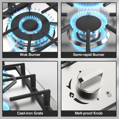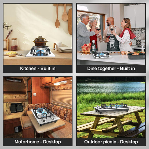 - Thermocouple Protection: In case the bulit-in 2 burner propane cooktop is not in working condition, or the gas is accidentally switched off in the middle of using, the gas channel will be shut off automatically to avoid gas leakage accidents and ensure the safety of your family