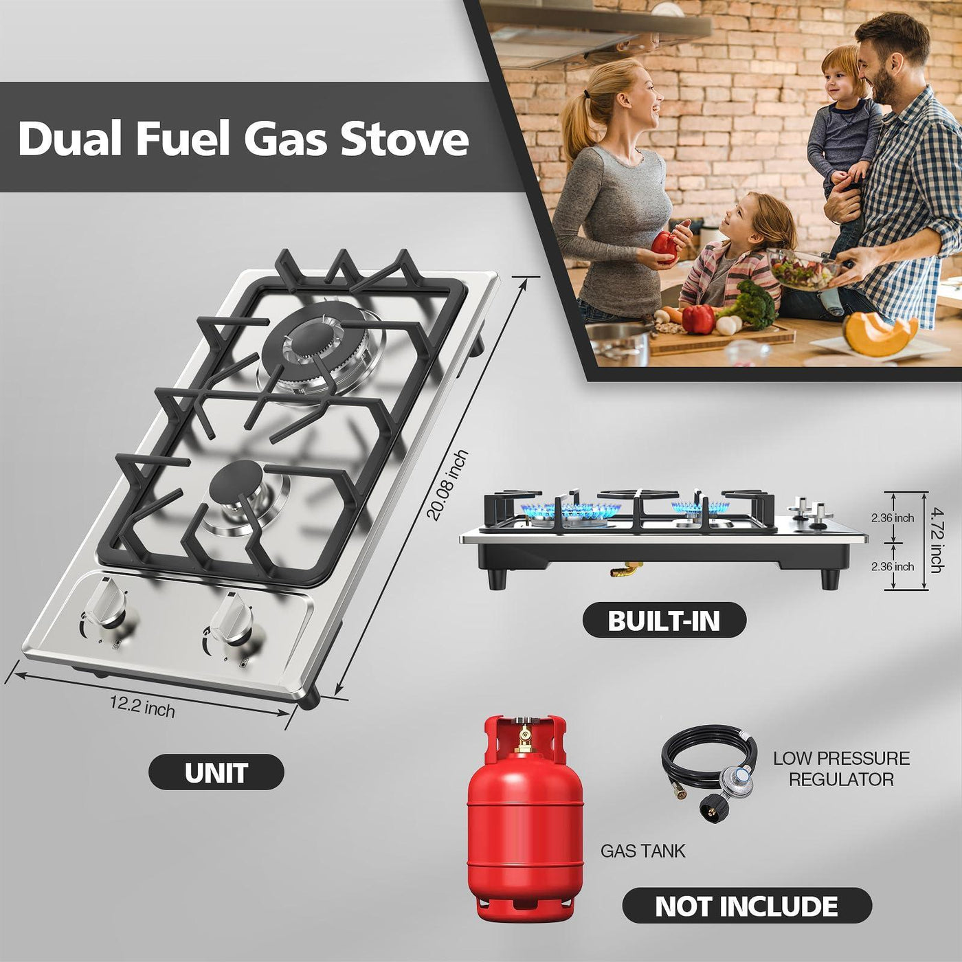 - Superior Quality Gas Cooktop: The surface of the gas cooktop 2 burner is made of stainless steel panels and has cast iron grates that are hard-wearing, durable and high temperature resistant. There is also a flame failure device to bring users a good sense of experience(Hoses not included)