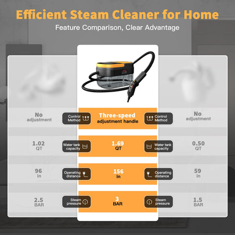 - Design: Steamer for Cleaning is equipped with a handle-mounted, three-level adjustable steam control function, ensuring precise output. Steam cleaner for home comes with a 1600ml water tank for extended use, reducing frequent refills. With a total stretching distance of 158 inches, this pressurized handheld steam cleaner can easily reach high or distant areas, making it suitable for tasks like bathroom steam cleaner for shower and steam cleaner walls floor and furniture
