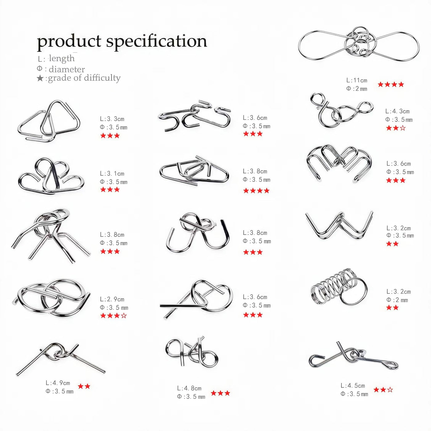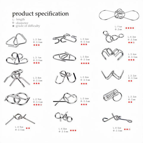 Details: Material Detail: Our metal wire puzzles are designed with children in mind, so we place a higher priority on quality. To make sure the kids' brain teasers are smooth and won't harm their hands, we use an integral shaping method. To enhance our materials and prevent rusting or deformation, we nickel plate them three times.
