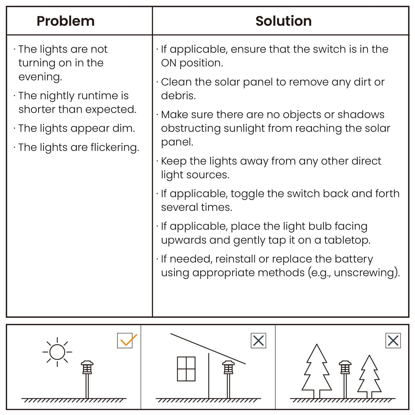 - QUICK START GUIDE : Ensure the switch is ON, charge in direct sunlight for 4+ hours (new arrivals may need recharging after shipping), and install in a place in direct sunlight (6+ hrs/day, no shade) and away from night light