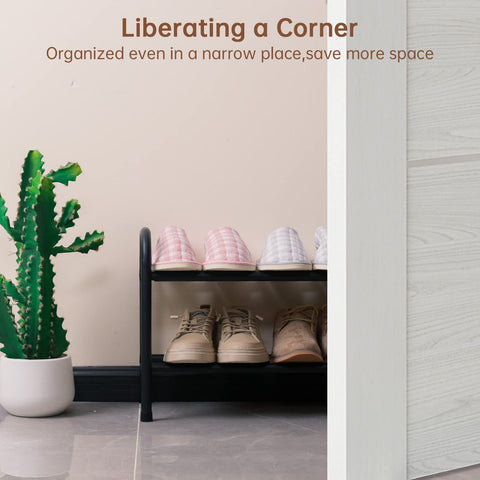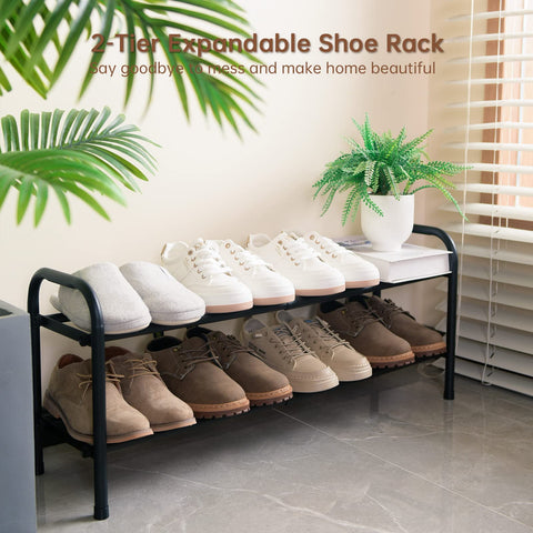 - Expandable Shoe Rack:This 2 tier shoe rack can be expanded up to 33.8" and holds up to 8 pairs of adult shoes. Great Solution for shoes organization of garage,entryway,bedroom,and small place.