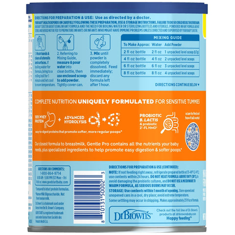 Details: Designed with baby’s comfort in mind, Good Start | Dr. Brown’s Gentle Pro Infant Formula Powder is formulated to provide complete nutrition for sensitive tummies. For babies 0-12 months, this easy to digest formula helps promote softer poops*. Modeled after the gentleness of breastmilk. Gentle Pro contains hydrolyzed proteins to support easy digestion. Gentle Pro is made using an advanced 2-step hydrolysis process that makes small proteins that are easy for tiny tummies to digest. This baby formula also contains B. lactis, a tummy friendly probiotic like those found in breastmilk. 2'-FL HMO, human milk oligosaccharide not from human milk. Gentle Pro is non-GMO, ingredients not genetically engineered. It contains no artificial growth hormones. No significant difference has been shown between milk derived from rbST-treated and non-rbST-treated cows. * Compared to intact protein formulas. Czerkies L. et al. Intl J Pediatr. 2018;2018:4969576.