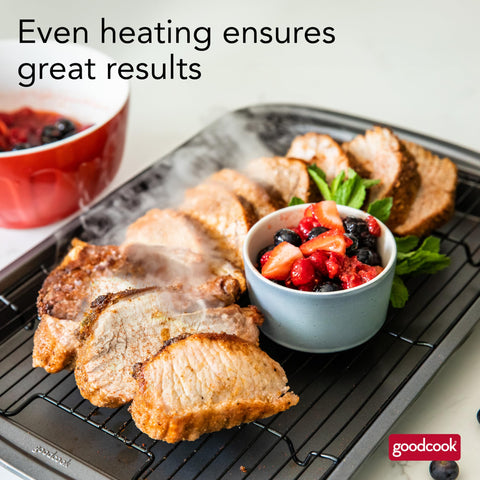 Details: Bring premium bakeware to your home kitchen with the GoodCook Everyday Crispy Baking Set. Designed with home cooks in mind, this nonstick bakeware set includes a cooking sheet and a wire baking rack to ensure perfectly crisp results every time in the oven. The raised baking rack elevates food away from juices and liquids on the tray to achieve a crispy texture, making it great for a variety of cooking tasks such as crisping bacon, chicken wings, fries, chips, and more. The versatile baking rack can also be used separately from the pan for glazing, drying, or cooling baked goods. The 15" x 10.5" cookie sheet distributes heat evenly for thorough baking and is made without PTFE and PFOA for an excellent release. It is also metal utensil safe so you can serve baked goods right off the sheet. Both the cooking sheet and the baking rack are oven-safe up to 410 degrees Fahrenheit as well as dishwasher-safe to make clean-up a breeze. This cooking sheet set is made with heavy-duty carbon steel with a gray finish to resist warping and offer delicious baking for years to come.