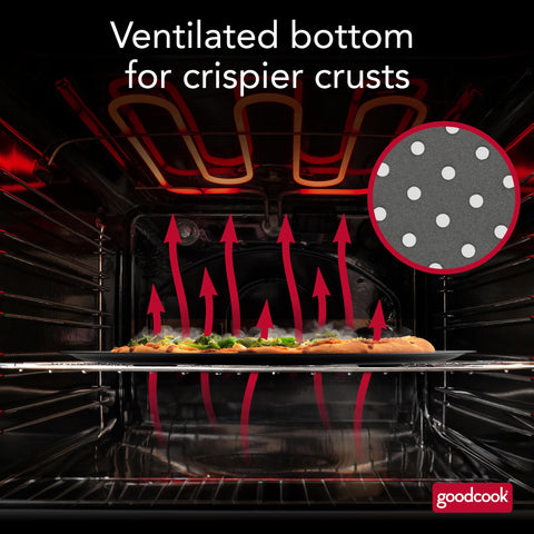 Details: Bring premium bakeware to your home kitchen with the GoodCook 16" Pizza Pan. This nonstick pizza pan ensures even heating and is perforated to reduce moisture for a perfectly crispy crust when making homemade pizza. Designed for anyone, it is also great for baking frozen pizzas and reheating leftover slices. The convenient cutting guides make it easy to serve perfectly even slices, while the feet on the bottom keep the hot pan elevated and off the countertop. The nonstick coating provides excellent release and makes cleanup quick and easy. This large pizza pan measures 15.75" in diameter and is made of nonstick carbon steel for premium-grade construction that resists warping to offer delicious baking for years to come.