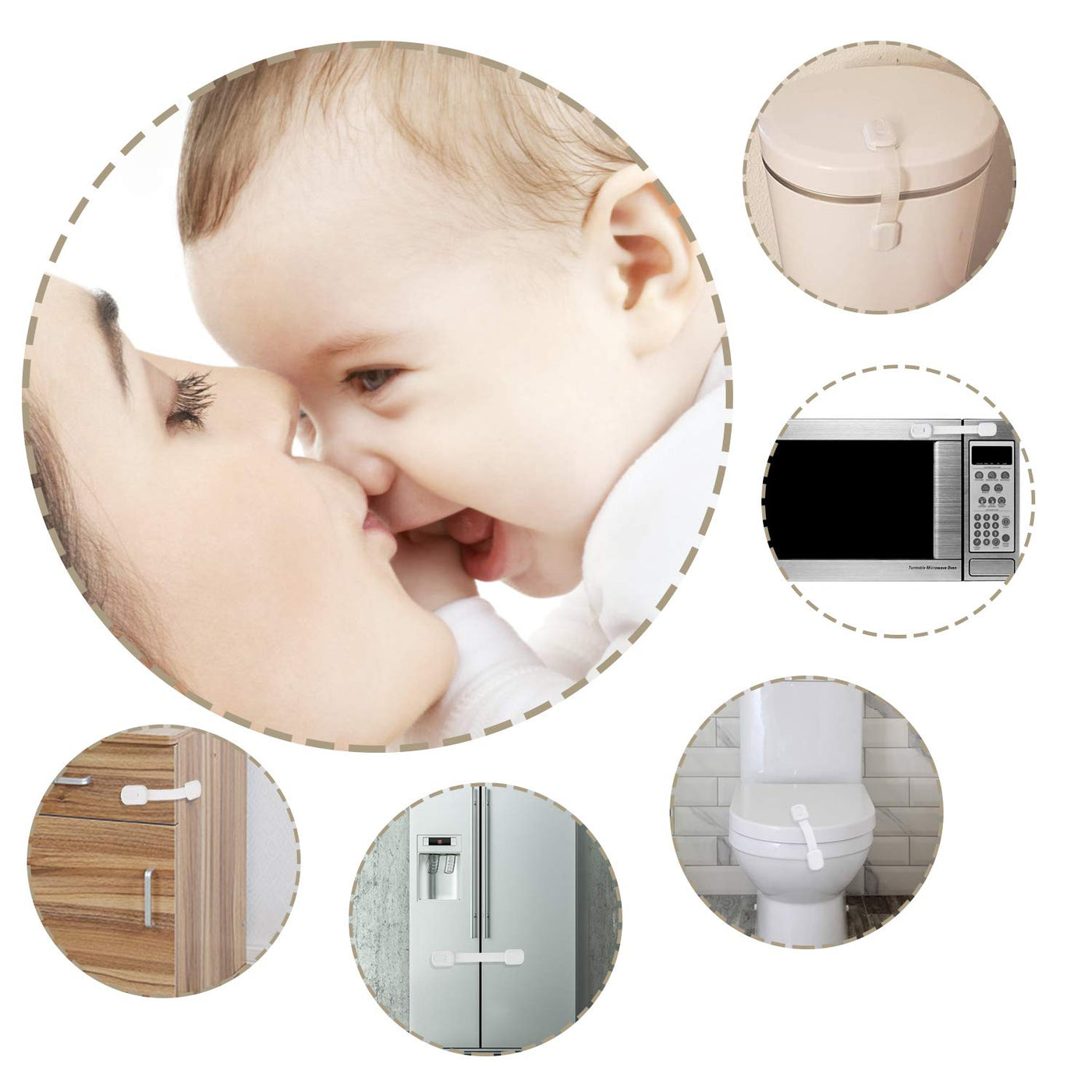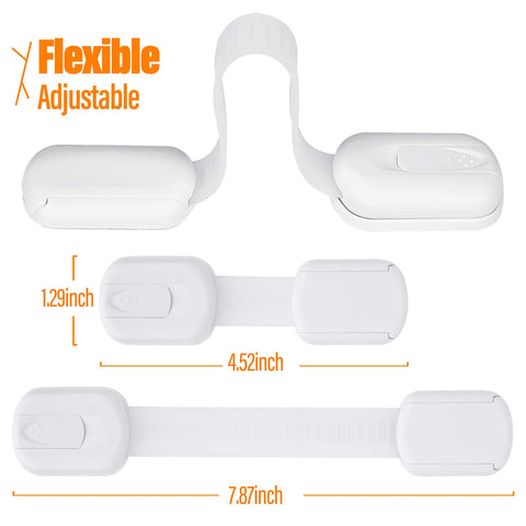 - MULTIUSE:Our child safety cabinet locks can adjust the strap length fit to cabinet,drawer,dresser oven,stove,fridge,wash machine,toilet seat,doors,trash can,freezer,slide doors,appliance,containers and more.Keep your baby,cat,dog away from the dangers in your home.