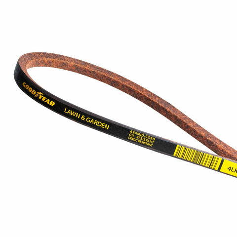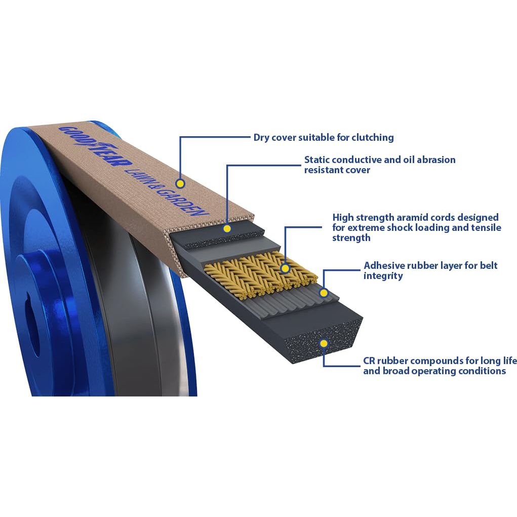 Details: Lawn & Garden belts operate under extreme conditions. This is why Goodyear Belts Lawn & Garden belts are designed to provide exceptional strength and durability. Help keep your outdoor equipment’s belt drive operating as it should by installing Goodyear Belts Lawn & Garden belts as part of your routine maintenance program. .Dual layer, dry cover for clutching applications .Cover is static conductive with both oil and abrasion resistance .Synthetic compression rubber provides a long life .Aramid tension cords provide outstanding strength and durability