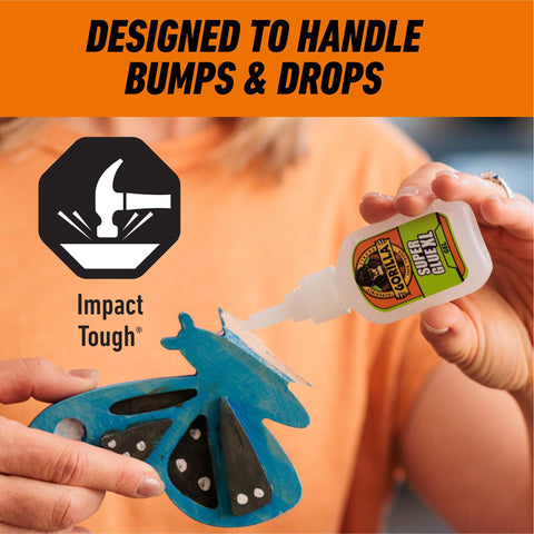 Details: Gorilla Super Glue Gel is an easy-to-use, thicker and more controlled formula* great for multiple surfaces and vertical applications. Developed for long-lasting repairs in an instant, the clear glue dries in 10-45 seconds. This super glue gel is specially formulated to absorb drops and impacts. Super glue, also referred to as cyanoacrylate glue, or CA glue, works on a variety of materials, including plastic**, metal, stone, ceramic, paper, rubber and more. In addition to its high-performance formula, we've added an anti-clog cap with a metal pin inside to ensure an airtight seal for maximum reusability. It's Gorilla tough, every time.