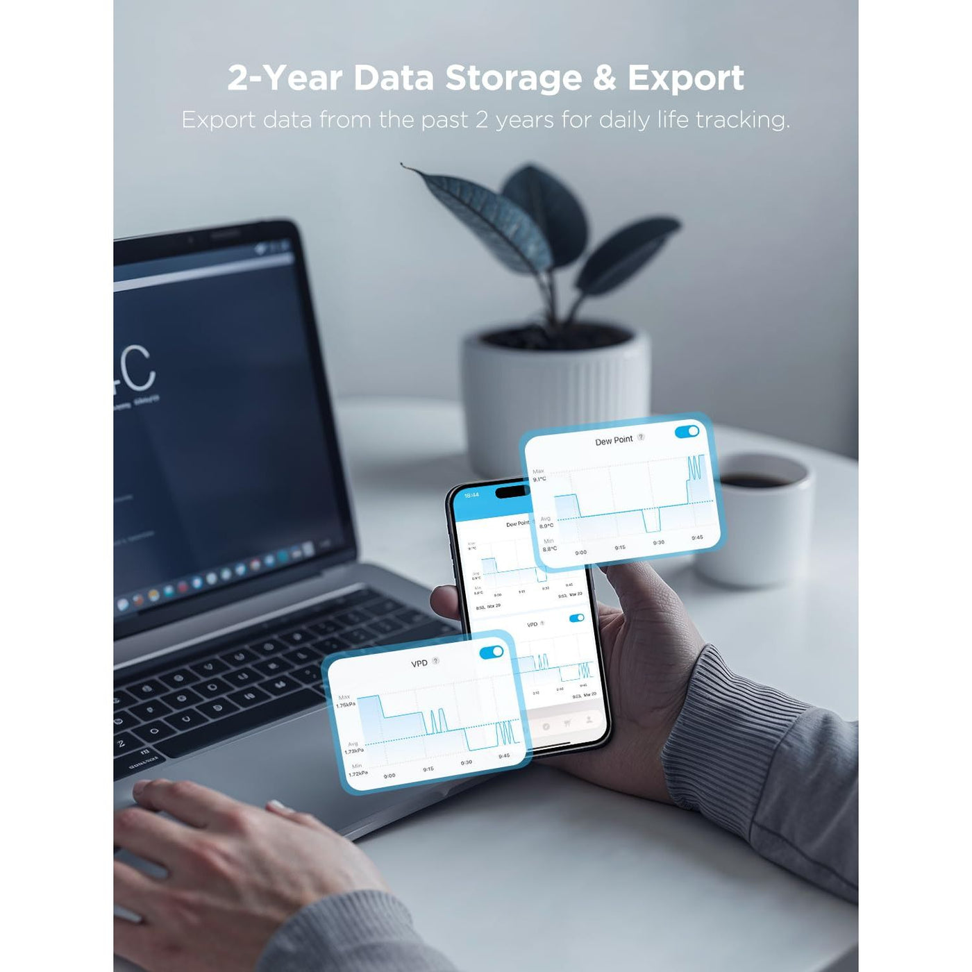 - Free Data Storage: Make plans according to historic temp and humidity data. The 20-day curve graphs provide a clear data-changing track. You can export data from the past 2 years and convert it to a CSV format. Stay on track of your daily routine.