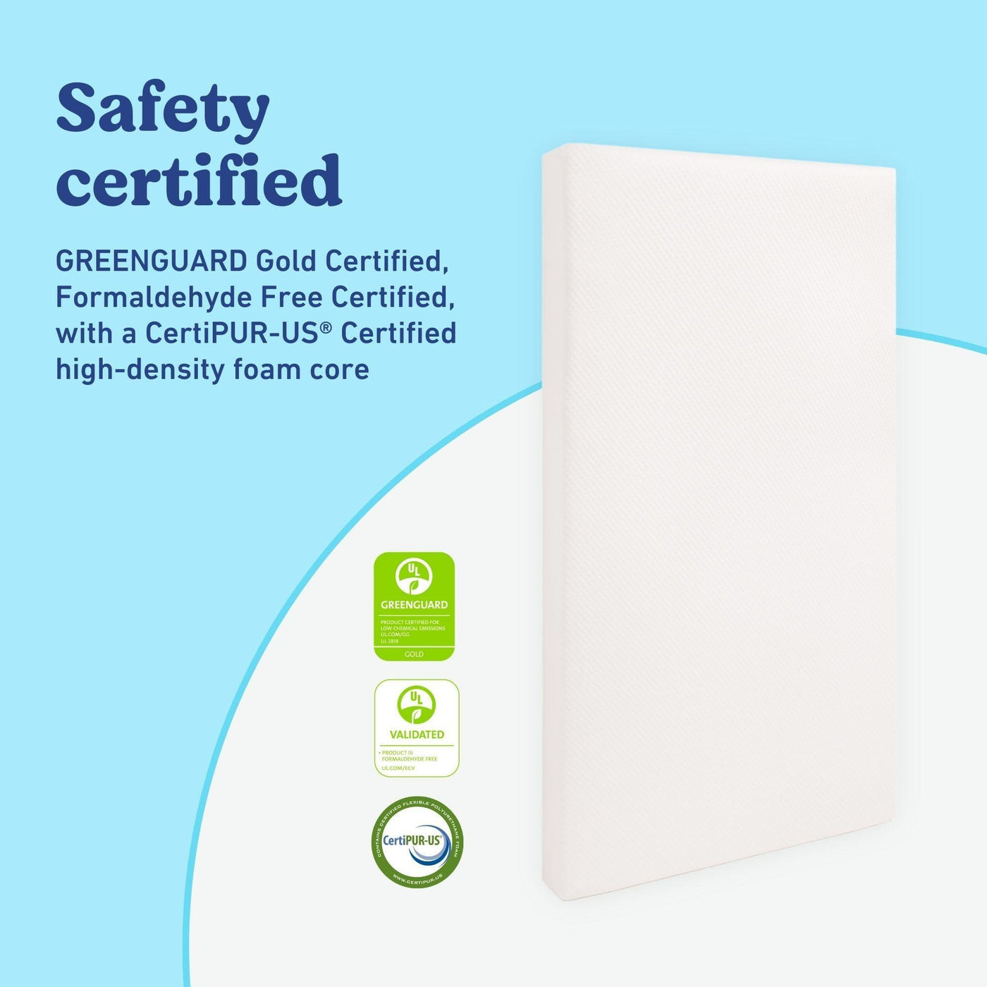 - GREENGUARD GOLD CERTIFIED & FORMALDEHYDE FREE CERTIFIED: Our award-winning baby crib & toddler bed mattress is GREENGUARD Gold Certified, contributing to cleaner indoor air for you and your family; Certified by UL to be free from formaldehyde
