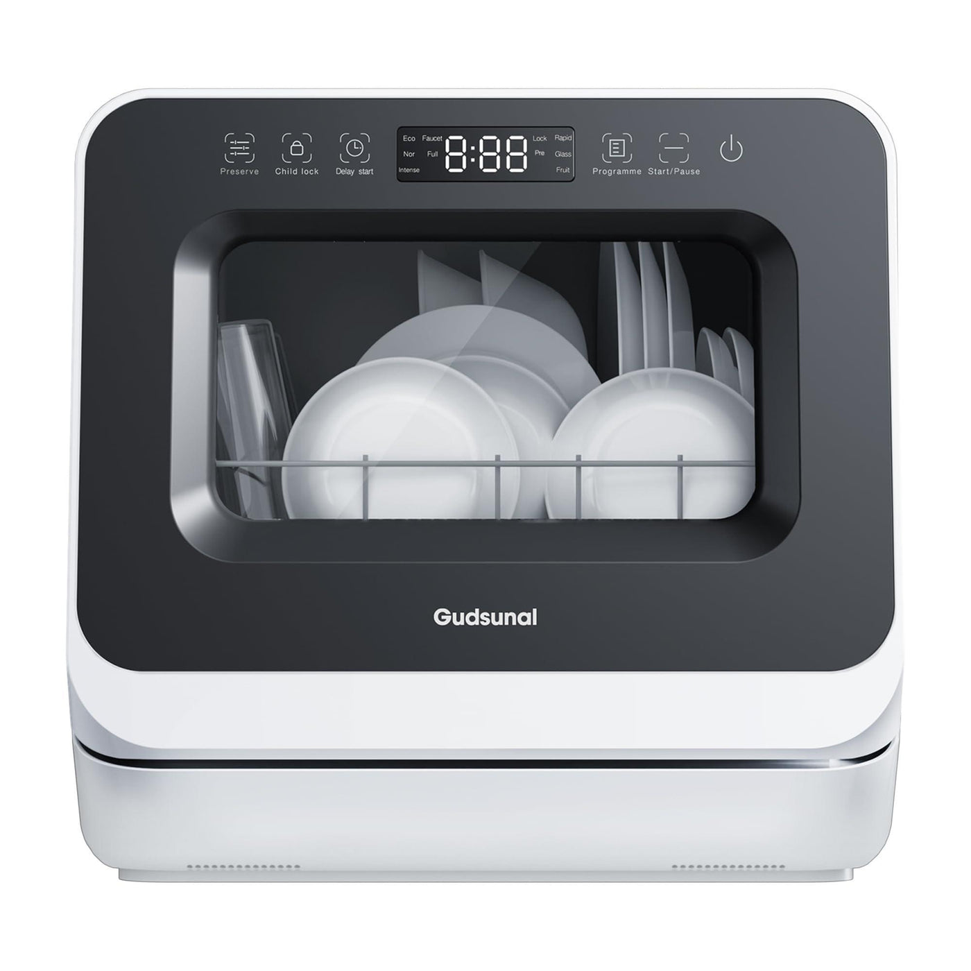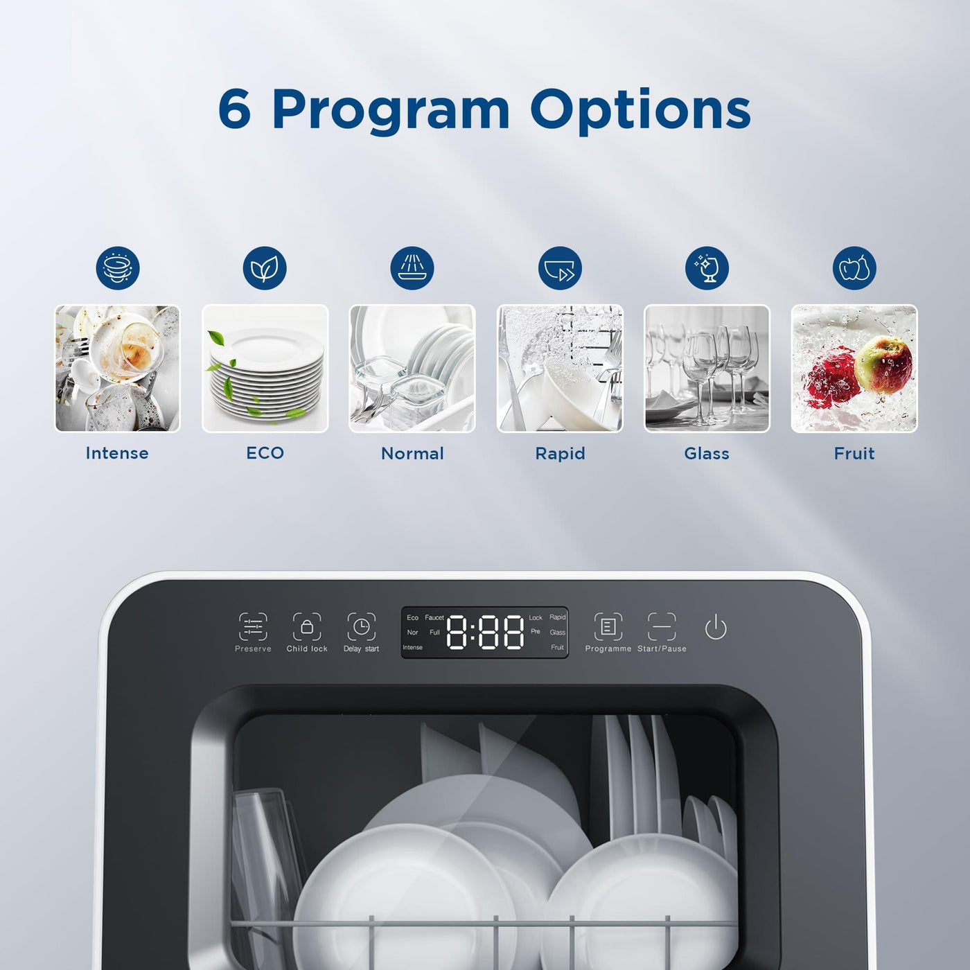 - 6 Program Options: This portable countertop dishwasher offers 6 programs (Intense, Eco, Normal, Rapid, Glass, Fruit) to cater to various washing needs, providing flexibility and thorough cleaning for different types of dishes