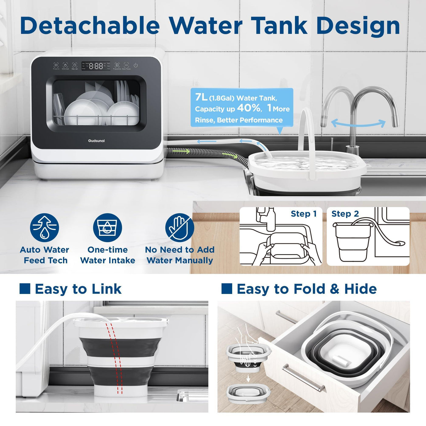 - Revolutionary Detachable Design: This countertop dishwasher features a detachable design with an automatic water intake function, eliminating the need for manual filling. The foldable, portable water bucket enhances storage convenience, making usage effortless