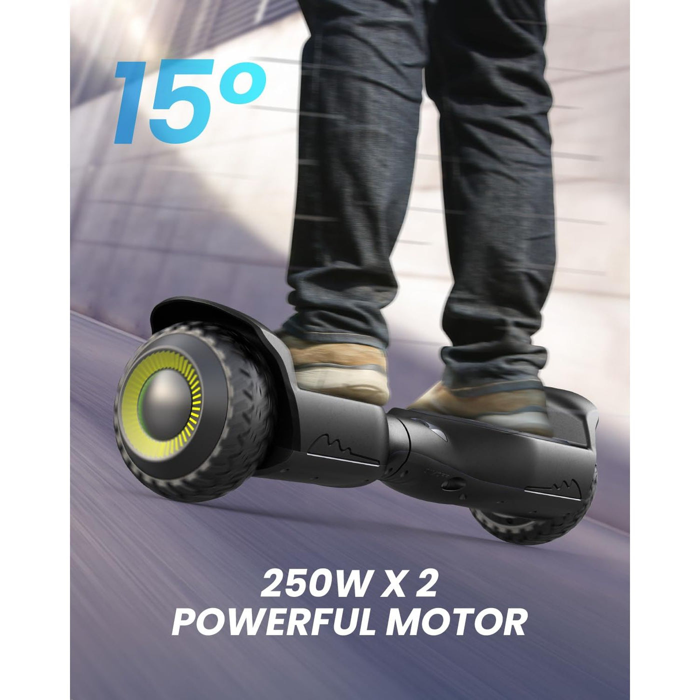 - Off Road balancing scooter - Dual 250W motors offer powerful performance allowing it to climb 15 degrees at a top speed of 7.75 mph. Non-slip rugged 6.5 off-road rubber tires make it easy for riders up to 176 pounds to travel through dirt, turf and even gravel on a variety of surfaces.