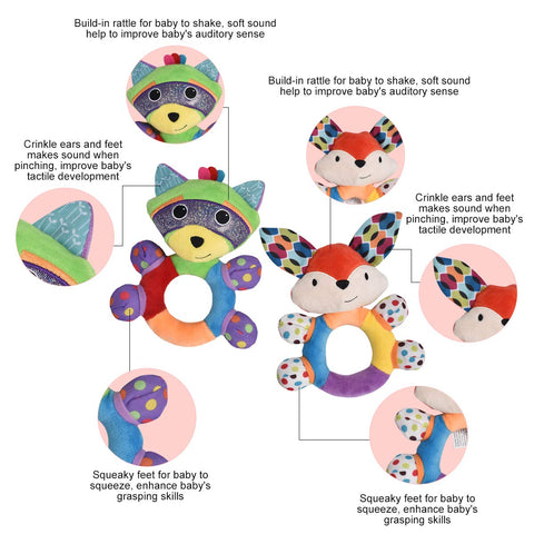 - SAFE BABY SENSORY TOYS: This cute stuffed baby car accessory toys include fox and raccoon which are high contrast, soft, multi-textured and well-made with high quality materials, comfortable and non-toxic, safe toys for newborn babies to snuggle with while stimulating baby’s sense of touch. Our rattle teether toys had been passed the test of of ASTM F963 & CPSIA & CPC by Third-Party Lab, conforms to Federal Toy Safety Standard, so just buying confident with HAHA Baby Toys.