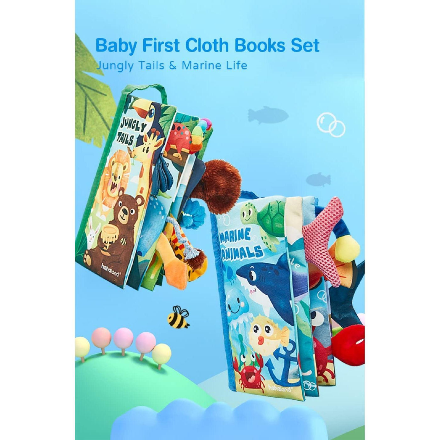 - SAFE FOR YOUR BABY: This baby book set features Jungle Tails and Marine Life designs with soft, chew-safe fabric that won't hurt your little one. The strong stitching can withstand teething and rough handling. There are no small or loose parts to worry about, so you can rest easy knowing your baby is safe while exploring these books. The lightweight and easy-to-clean features make them ideal for on-the-go playtime