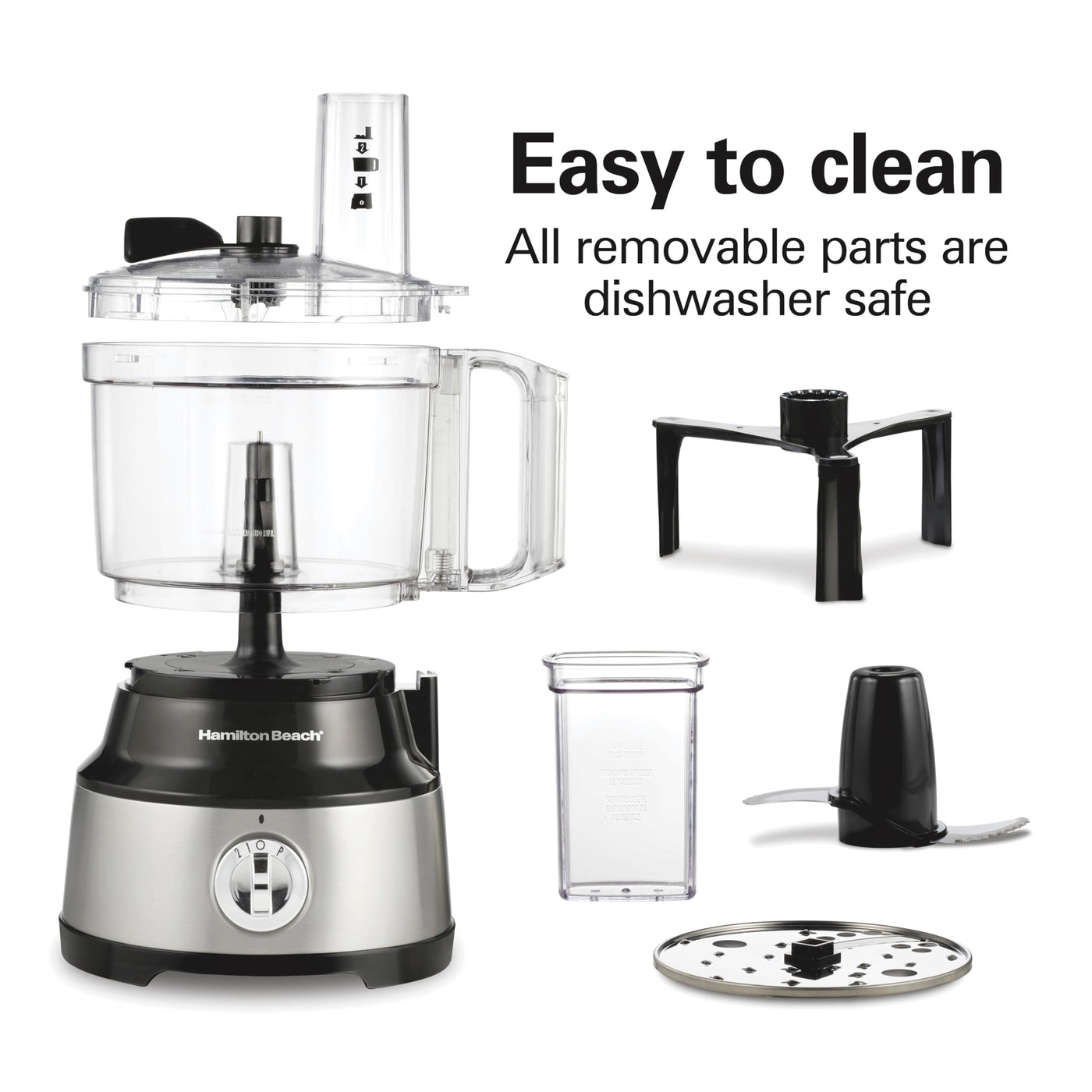 Details: With the Hamilton Beach Bowl Scraper Food Processor, there's no need to stop and remove the lid to dislodge food from the side of the bowl. The built-in scraper does the work for you, even while the processor is on for continuous processing. Kitchen tips: For a more uniform consistency, start with pieces of food that are similar in size. Cut food into 1-inch (2.5-cm) pieces before processing with the chopping/mixing blade and leave room in the bowl for the food to be tossed around. When chopping foods, pulsing on and off will produce the best results. Operating time will depend on the quantity of food being processed. Most foods can be sliced, chopped, or shredded in seconds. To slice or shred cheese, use firm cheeses like Cheddar or Swiss that have been chilled for at least 30 minutes. Soft cheese like Mozzarella must be placed in the freezer for 30 minutes prior to processing to ensure it is firm enough for shredding. All removable parts are top rack dishwasher safe.