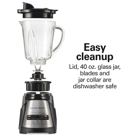 - EASY TO CLEAN WITH DISHWASHER SAFE GLASS JAR, LID AND BLADES: This Hamilton Beach blender has a glass jar that holds 40 ounces; The jar, lid, and removable blades on the blender are all dishwasher safe.