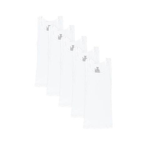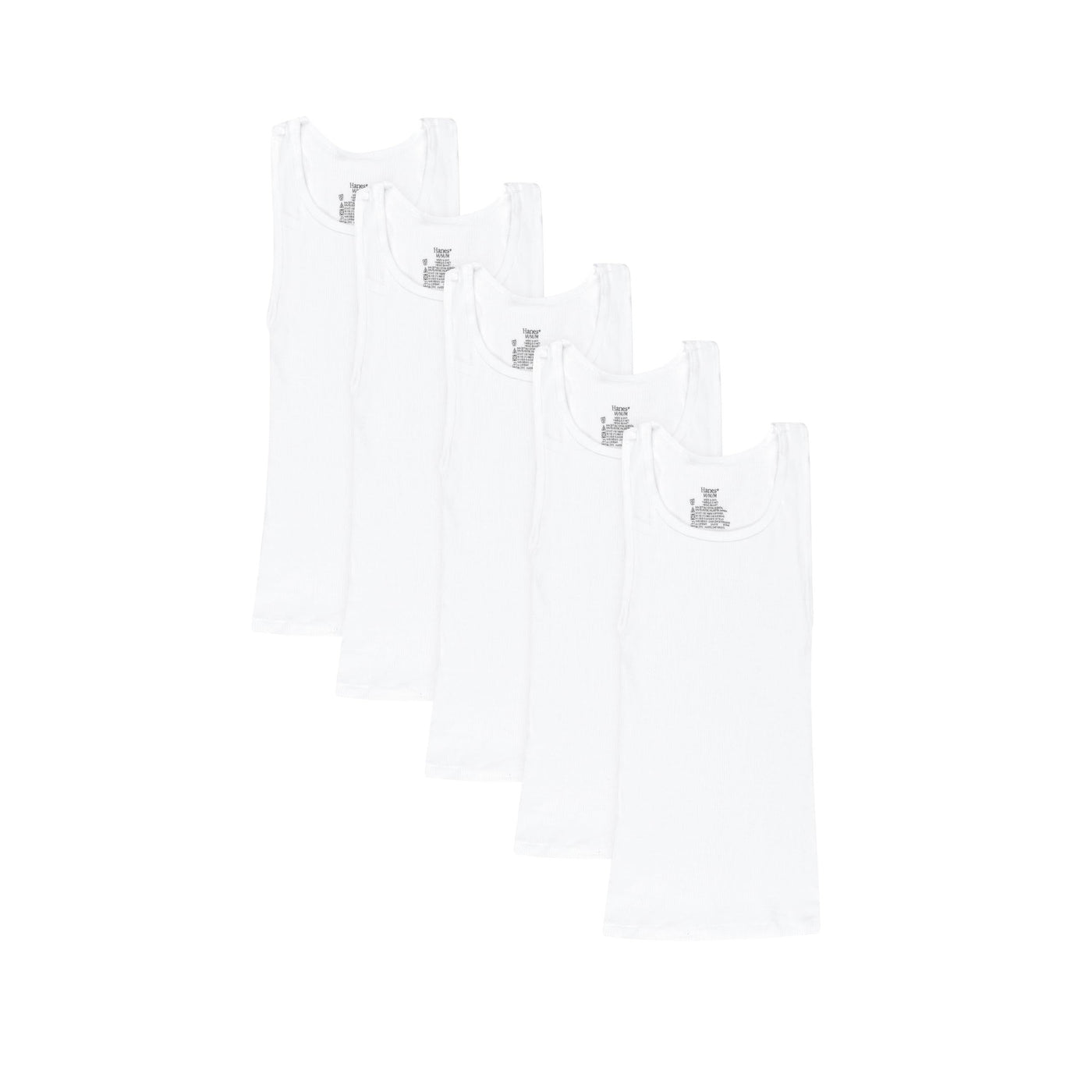 Hanes® EcoSmart® boy's tanks are crafted from a lightweight 50/50 cotton polyester-blend fabric that features a portion of recycled fibers. The feel-good style of these white tank tops for boys offers moisture-wicking technology, keeping him cool and fresh no matter how hard he plays. Double-ply neckband is just one of the sturdy details in Hanes® tank tops that are made to last. Even better, these boys' undershirt tanks are preshrunk for a fit that stays true. This comfortable style is finished with a smooth Tagless® interior for itch-free comfort. Hanes® boy's tanks come in a convenient 5-pack so you can stock up with ease.