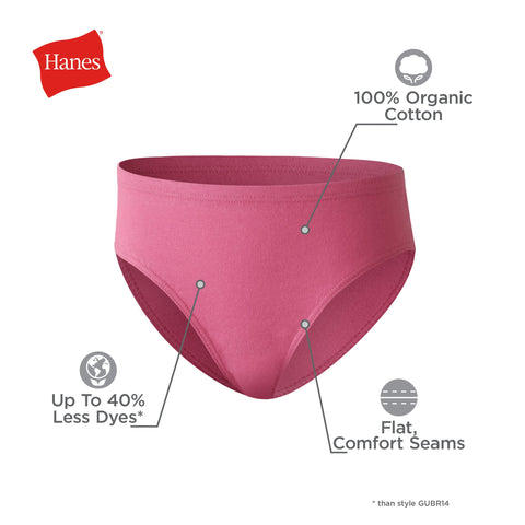 Extra gentle on sensitive skin, this girls’ underwear pack from Hanes® is crafted from 100% organic ringspun cotton. Designed in a classic brief cut, she’ll enjoy the comfort and full coverage of these girls’ panties. Stretch comfort side seams and a no-ride-up design make these ideal for girls on the move. Created with a Tagless® interior for itch-free comfort, this Ultimate® pure comfort girls’ brief pack is sure to become her favorite. This convenient girls’ underwear 8-pack is available in an assortment of bright and fun prints, giving her the options she wants.