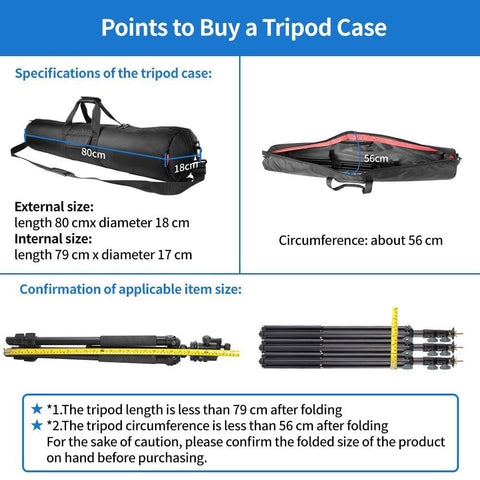 - Compatible Equipment: HEMMOTOP 80 cm tripod bag is compatible with tripods up to storage length of 31 inches. Size: Length 31.5 in (80 cm) x diameter 7 in (18 cm)