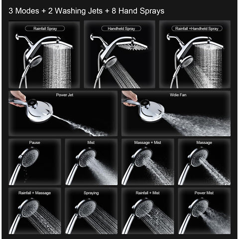 - Larger coverage shower heads with handheld spray combo, our large 12 inch square shower head allows for full body water coverage. Equipped with 10 spray settings hand held shower head, you can enjoy cozy showering, extra 2 different mode power jets can clean your pets or wash your bathroom and bath easily