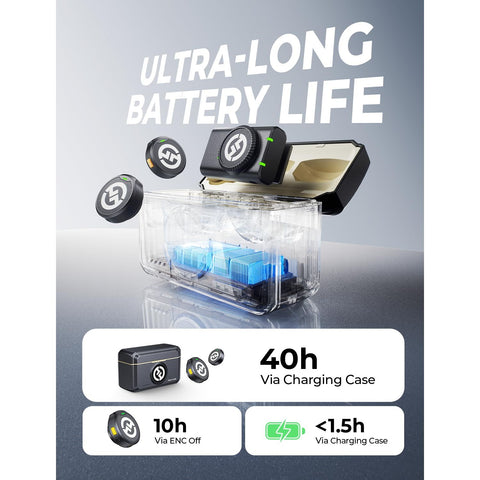 - [Extended 40-H Battery Life] With optimized power efficiency, the LARK M2 wireless microphone can work for up to 10 hours (with ENC off). The compact charging case can fully charge the entire set twice, and each charge takes less than 2 H. With the charging case, the camera version has a battery life of 40 H. No more worrying about low battery situation.