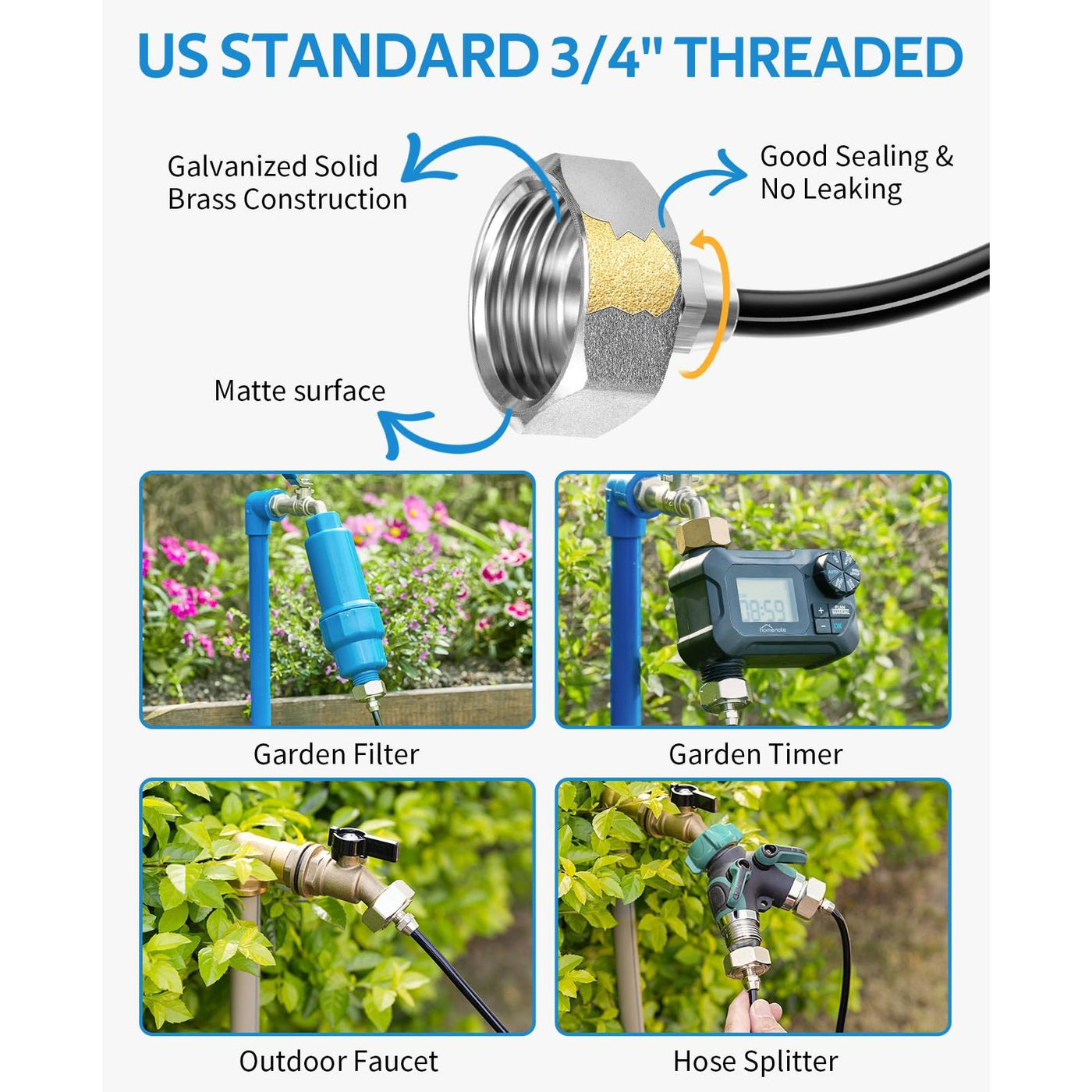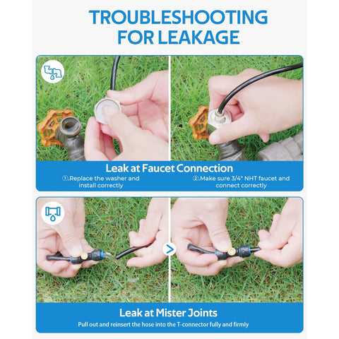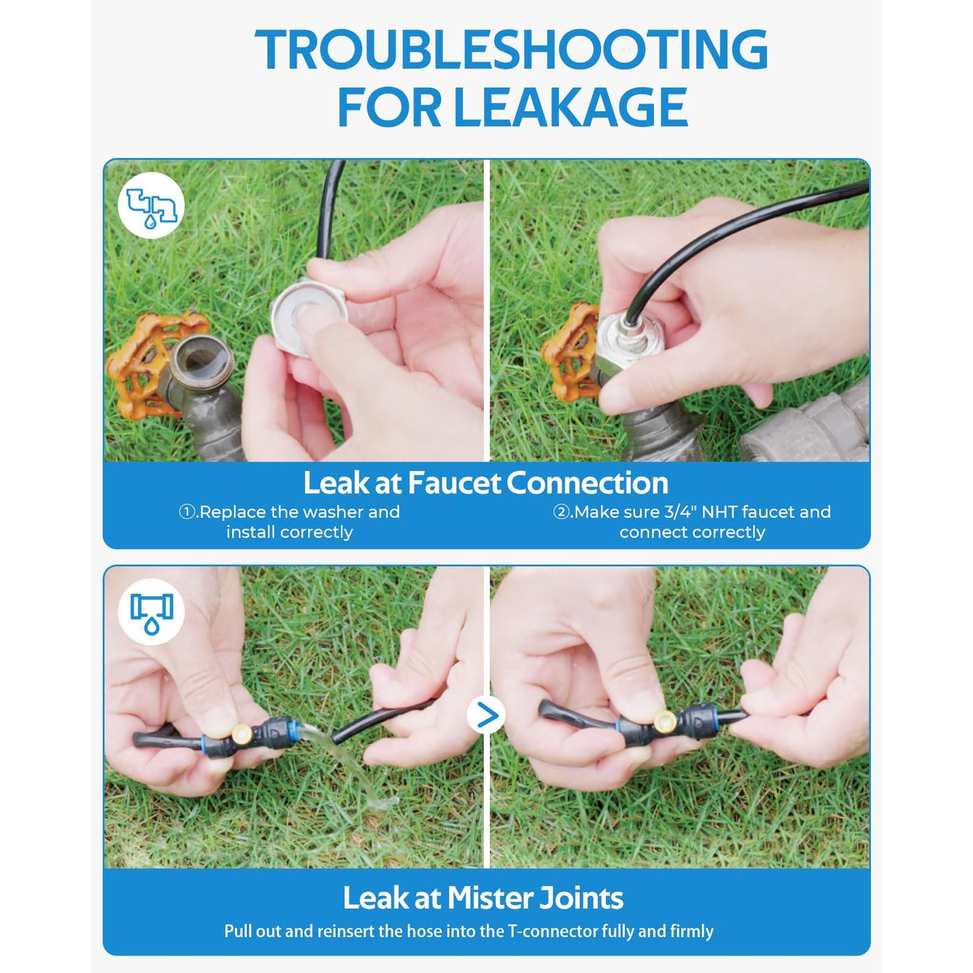 - Premium Mist Effet: 26ft Misting hose (1/4inch PU tubing), 7 exclusive brass misting nozzles, a solid brass 3/4" NHT hose faucet adapter ensure a better misting cooling system with no leaking, no blocking, no rusting and long-life use