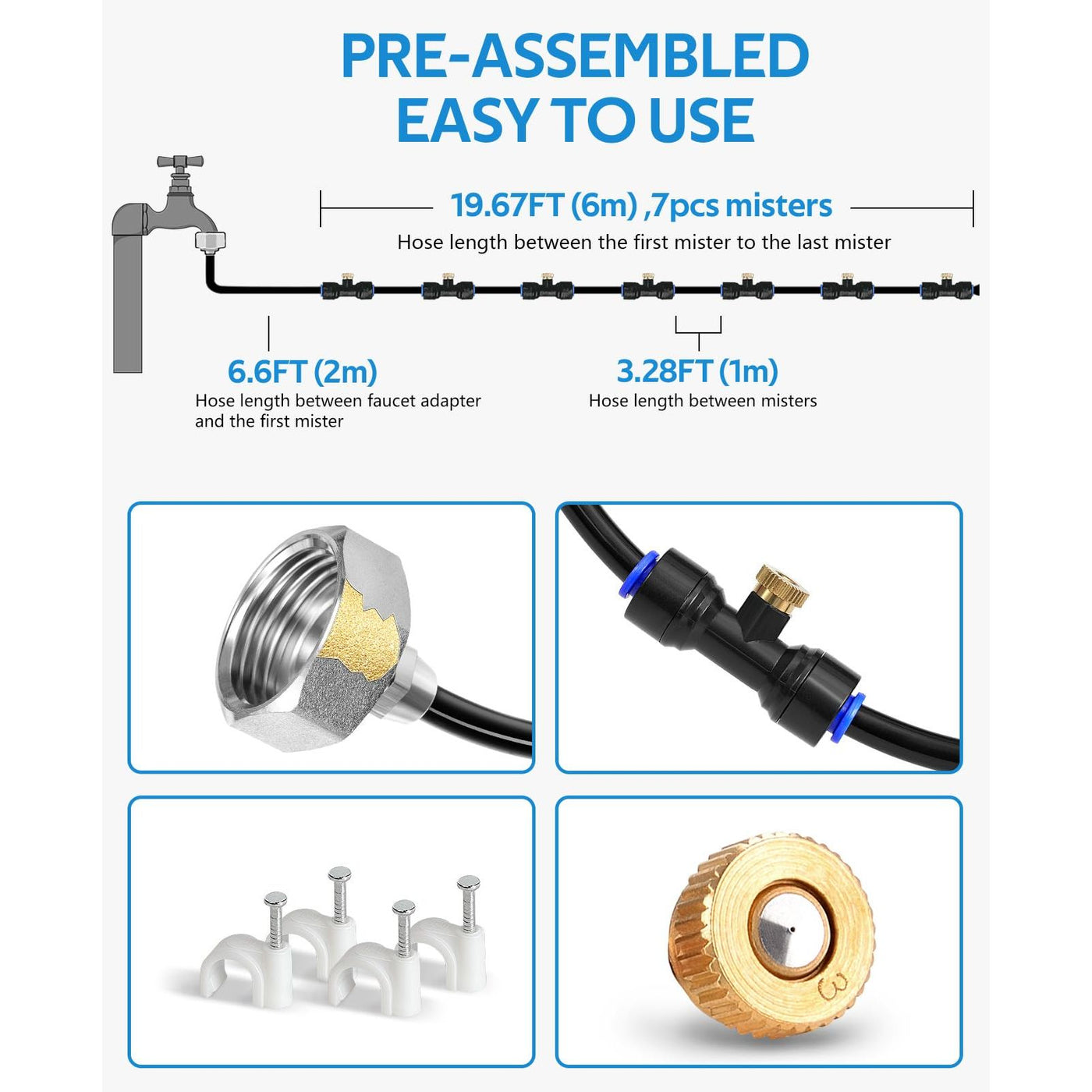 - Pre-assembled mister system is easy to install, saving time and effort. No complicated installation process required! You can easily customize it to suit your needs by simply increasing or decreasing the number of nozzles