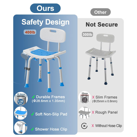 - 400lbs Durable Shower Chair: HOMLAND bath chair made with reinforced aluminum alloy frames, provided max strength up to 400LBs. Recommended user weight 300lbs. Comes with a clip holder for easy placement of showerhead