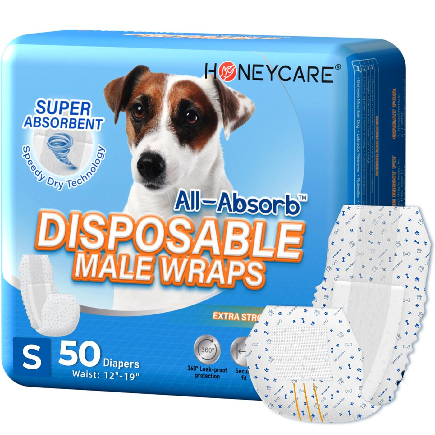 DRY AS A BONE - All-Absorb Male Wraps have 360 degree leak-proof protection barriers, and a super absorbent core which prevents any unwanted spills or accidents where you don't want him to mark. Designed to fit small sized male dogs with a 12-18 inch waist