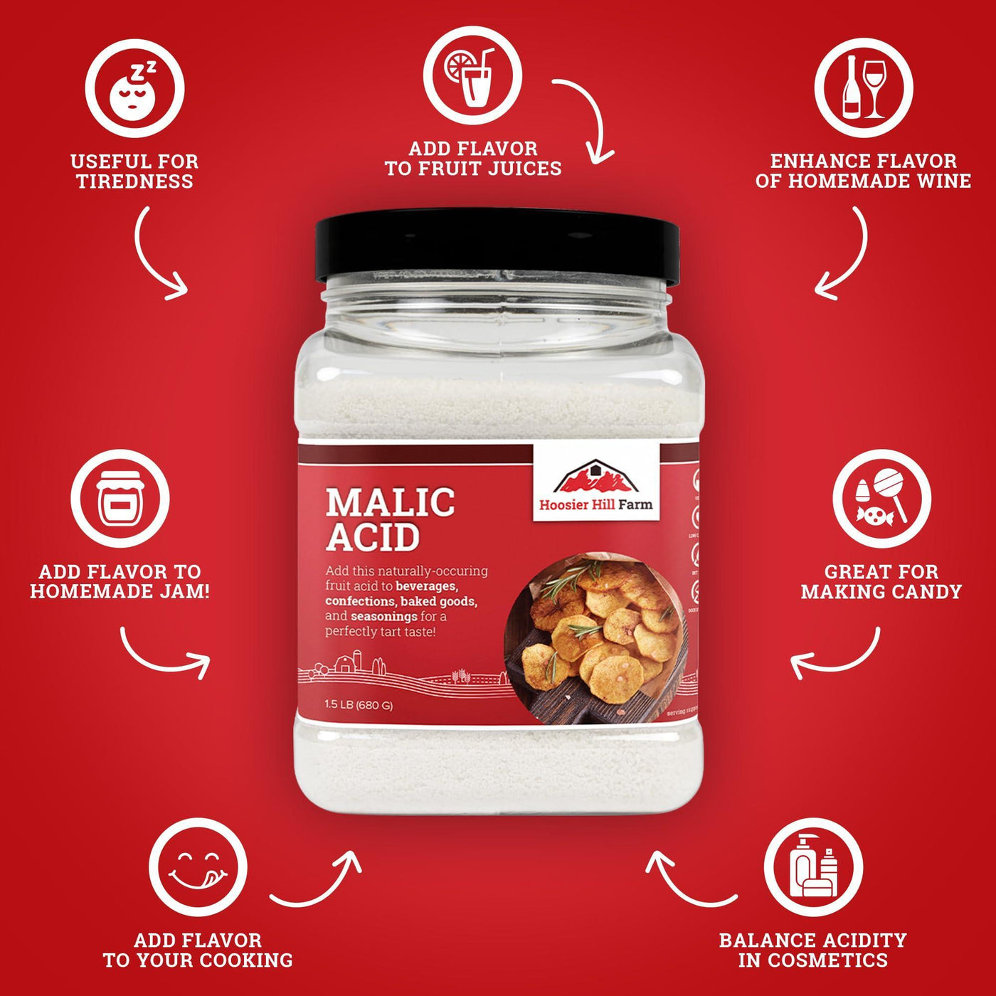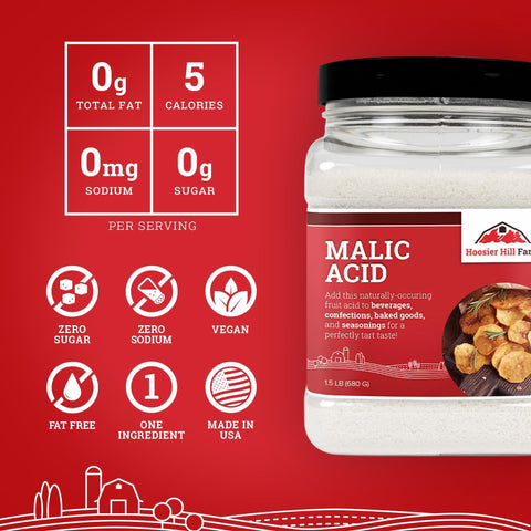 - Hoosier Hill Farm Malic Acid Powder is a naturally occurring organic compound that is most commonly found in fruits like apples. Our food-grade malic acid powder is a natural food additive with a sharp, sour flavor. Its tart taste is perfect for a variety of recipes including adding sour flavor to candy or vinegar flavor to potato chips, french fries, and other savory snack foods. This versatile powder can also be used in winemaking.