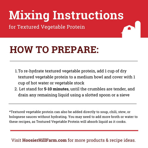 - How to Prepare Textured Vegetable Protein: To rehydrate textured vegetable protein, add 1 cup of dry Textured Vegetable Protein to a medium bowl and cover with 1 cup of hot water or vegetable stock. Let stand for 5-10 minutes, until the crumbles are tender, and drain any remaining liquid using a slotted spoon or a sieve. This method works great when making tacos, sloppy joes, and stir-fries.