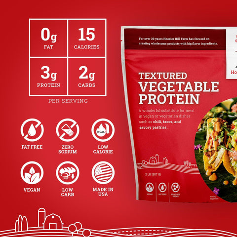 - Hoosier Hill Farm Textured Vegetable Protein is a nutrient-rich soy protein product that’s a great alternative to meat in a variety of recipes. This meat alternative made from soybean flour is a great source of plant-based protein and fiber while being low in fat.