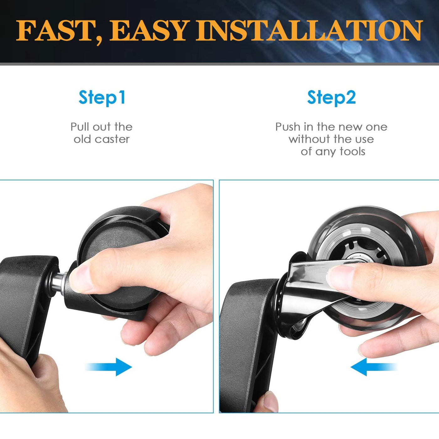 - Easy assembly, your office chairs will look more attractive by using these office chair caster wheels. Our caster wheels did not require tools for replacement, simply pull out the old wheels from the chair base, push the stem of your new chair wheels into the socket and finish in 10 minutes