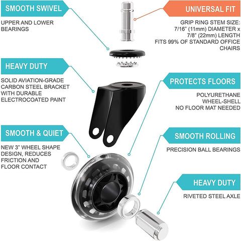 - Smooth and quiet rolling, no squeaking and rattling from your office chair anymore. Precision ball bearings and a soft polyurethane wheel-shell make chair rolling silky smooth and quiet on any surface without disturbing anyone. The rubber chair casters designed for universal standard stem size: 7/16 " x 7/8 "(11x22 mm), suitable for 99% office chairs brands of Miller Steelcase, Aeron, Herman, Dxracer, Humanscale Freedom, Lazyboy Serta, Hon, Boss, etc. IMPORTANT: Not for IKEA chairs