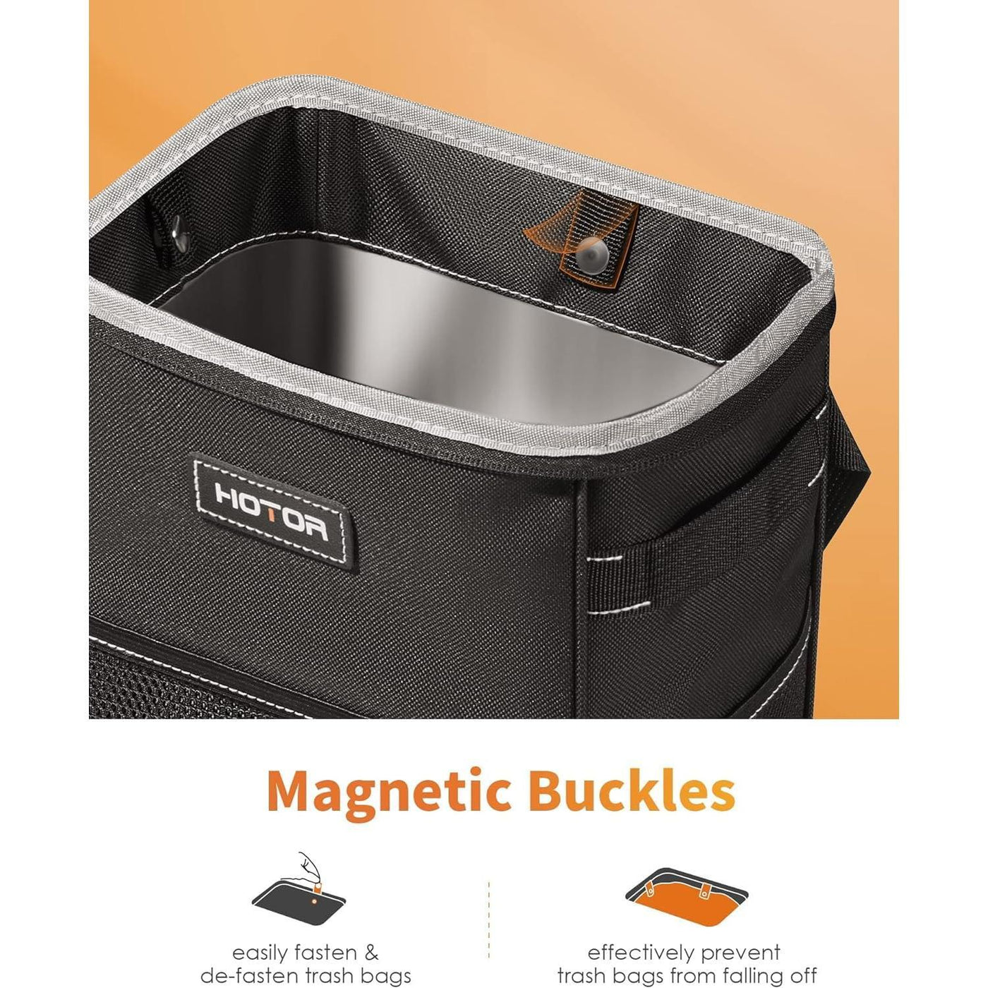 - ✔MAGNETIC SNAPS: There are 4 metallic magnetic snaps inside of HOTOR car trash can for fastening the extra trash bag. Compared with traditional car trash cans, those 4 little snaps make the replacement of car trash bags easier. Simply unsnap the magnetic snaps to replace the used trash bag with a new one. Then snap shut the magnetic snaps to fix the extra trash bag. Just 2 steps and and it's all set.