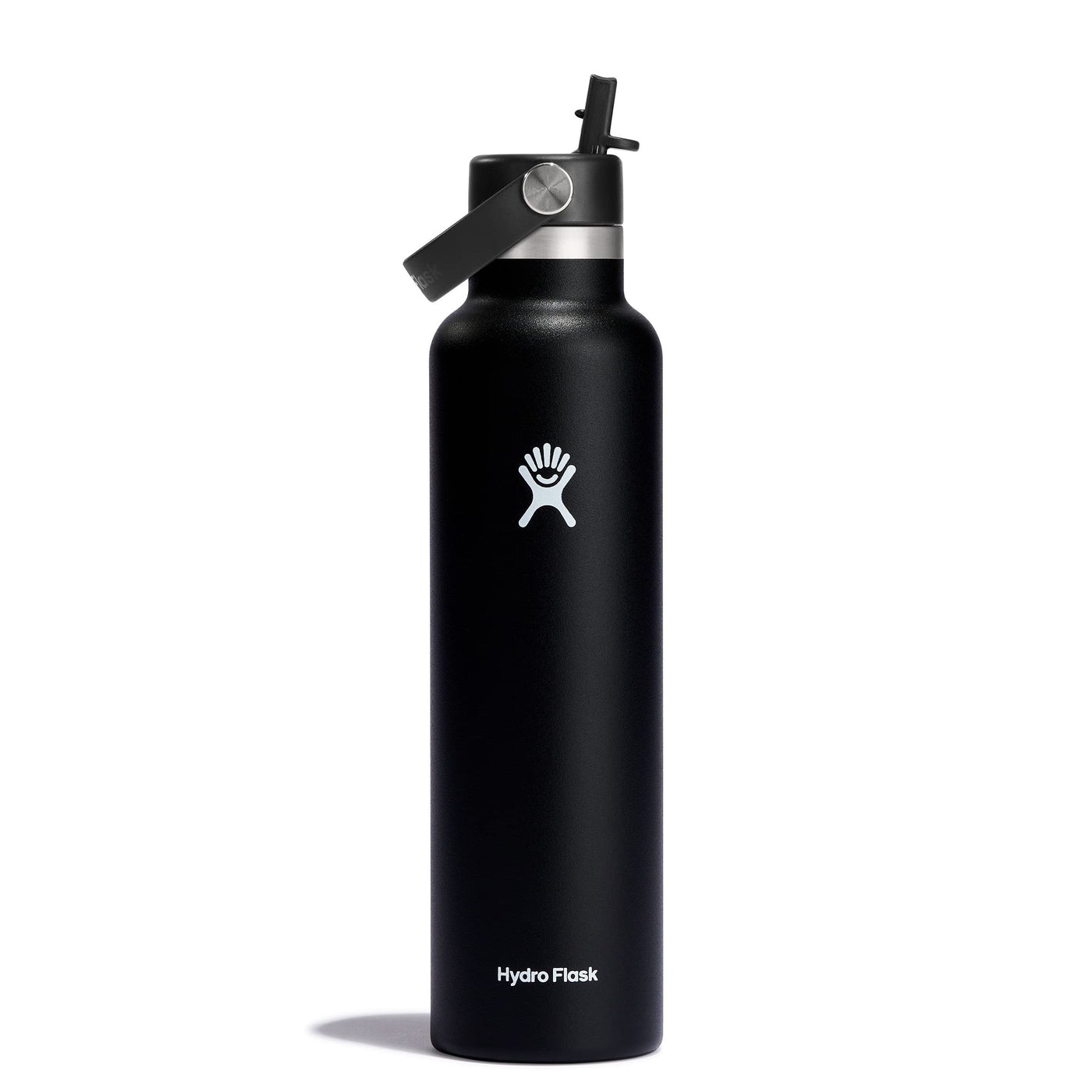 24 OZ BLACK STRAW BOTTLE: A 24 oz Standard Mouth water bottle with small drinking spout with Hydro Flask's leakproof Flex Straw Cap—easy to fill, easy to drink. Open it up, add your ice, and flip to sip. The insulated stainless steel keeps it cold for up to 24 hours.