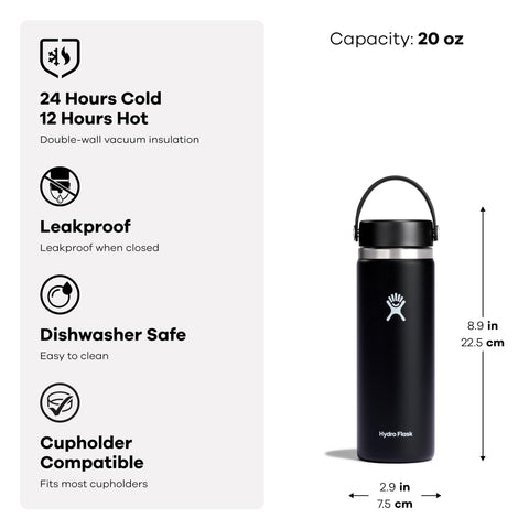 Details: Stay hydrated with the Hydro Flask 20 oz Wide Mouth Bottle. With a comfortable, flexible handle, the reusable water bottle is leakproof with double-wall insulation to keep drinks cold up to 24 hours and hot for up to 12 hours. The insulated bottle fits in most cupholders and is dishwasher safe. 24 hours cold. 12 hours hot. TempShield® double-wall vacuum insulation. Leakproof when closed. Won't retain odor or leftover flavor. BPA-Free. Dishwasher safe. Easy to clean by hand or dishwasher. Stays clean and colorful. Not for use on a stove, in a microwave or freezer. Keep hot drinks out of the reach of children. Bottle fits all Wide Mouth caps and lids, including the leakproof Flex Straw Cap, Flex Chug Cap, Flex Sip Cap for hot drinks and stainless steel Flex Cap.