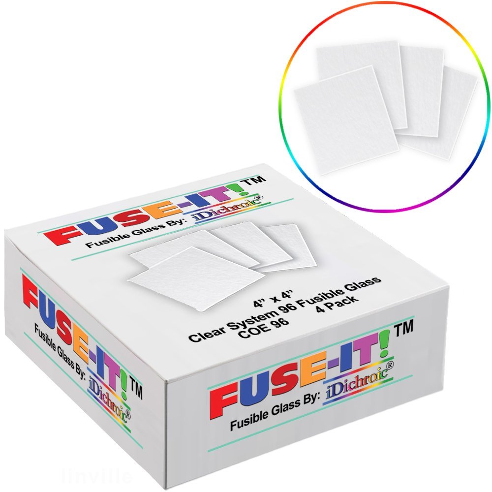 Details: The Perfect Size for the Small Glass Studio Pre-cut clear fusible glass squares are easy to store and even easier to work with Add fun decoration with Dichroic Glass, stringers, fusing photo paper, pre-cut glass chips or a multitude of other fusible options for instant art. Incorporate squares into larger fused projects, or cut and nip them down into pieces the perfect size for jewelry. Squares measure approximately 4". Sold in packs of four. 96 COE.