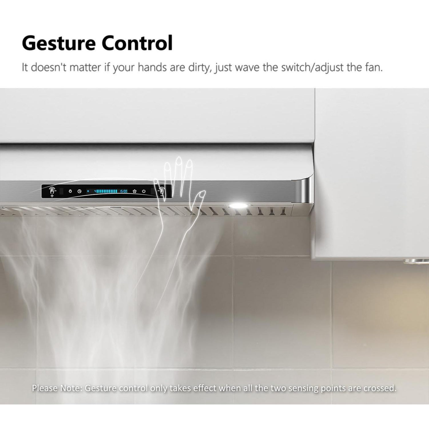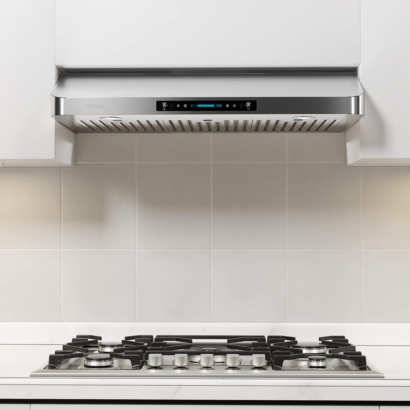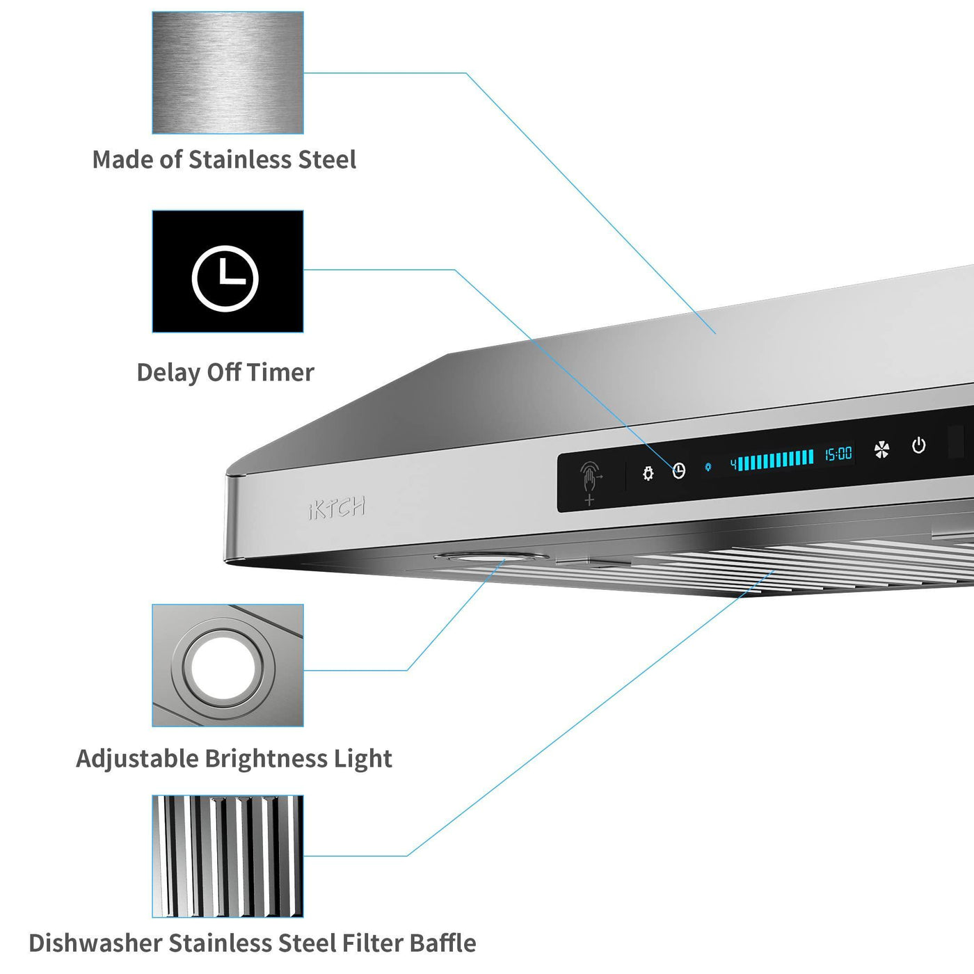 - Modern Smart Design: Gesture Sensing & Touch Control Switch Panel, digital screen, full stainless steel body, delay shutoff, all that integrates beautifully with your kitchen remodel, giving your kitchen a modern, restaurant-like feel. IKTCH hood range is also designed specially with beveled sides and a rolled hem bottom, intimately protecting you and your family's safety