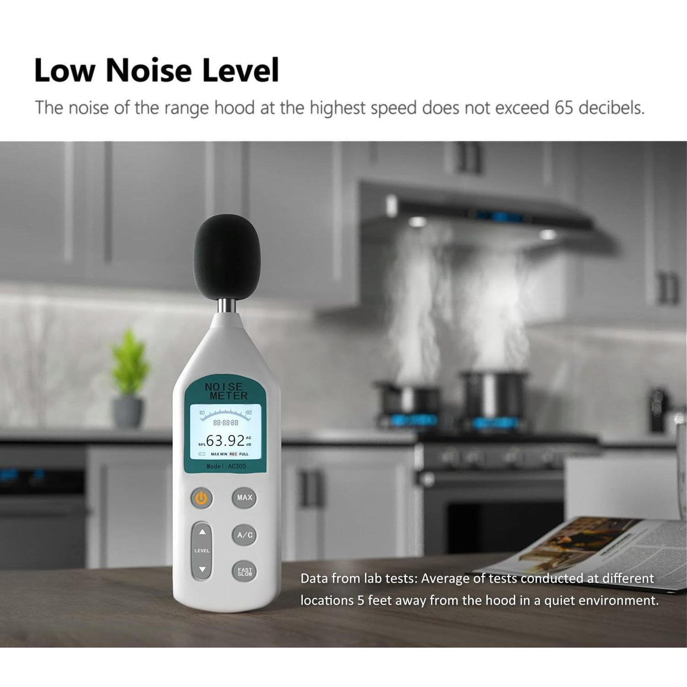 - Ultra-quiet operation: Maintains a noise level of less than 65 dB at high speeds, and the noise level is at 40 dB on the lowest setting. The high-performance 4-speed motor effortlessly and quietly ventilates your kitchen to remove cooking odors and smoke