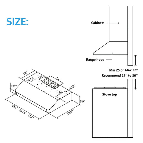 - Ideal Size: Stove Hood measures 30". Small profiles are very suitable for small kitchens in apartments. It can be installed at least 25.5" above the stove top to maintain the best smoke removal effect, which is space-saving
