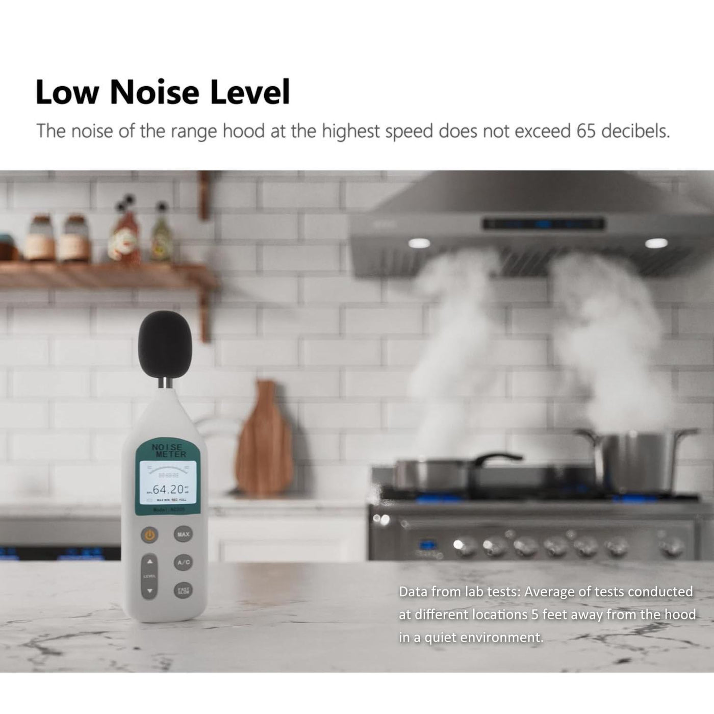 - 【Ultra-Quiet Operation】: Customize your kitchen stove vent with the 4-speed setting to play with the suction and noise level. The noise level is at 40 decibels on the lowest setting and only 65dB max noise level.
