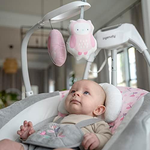 Details: Designed for baby’s ultimate comfort, the Ingenuity SimpleComfort Compact Soothing Swing - Cassidy helps make your day easier. This innovative, oversized seat with adjustable recline is a must-have for new parents, designed in the USA by the #1 Manufacturer of Baby Entertainment*. This swing features 3 swing directions and a seat that rotates 180 degrees. The GentleTouch control panel lets you customize baby's soothing. The overhead mobile features 2 engaging plush characters, a flower and birdie. Baby can enjoy up to 30 minutes of soothing vibrations, and the full-size swing has a 30-, 45-, or 60-minute timer, with auto shut-off after 2 hours. Baby can enjoy up to 20 minutes of soothing melodies, and parents can select high or low volume. Easy care fabric is machine washable for easy cleaning. Included USB cord powers the swing motion and music. 1 C battery powers the vibration unit (AC adaptor and batteries not included). Vibration unit battery is located at the base of the swing in a separate compartment, and the cover can easily be removed. (*Circana, Retail Tracking Service, U.S., Entertainment products, dollar sales, Jan-Nov 2023 combined)