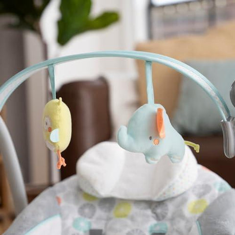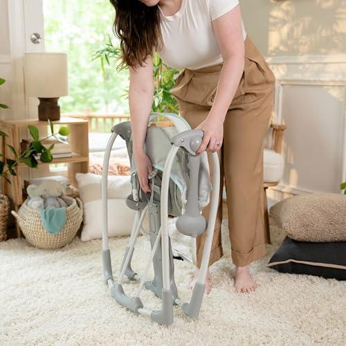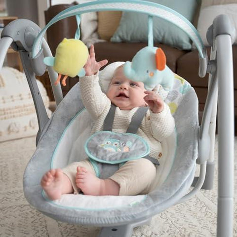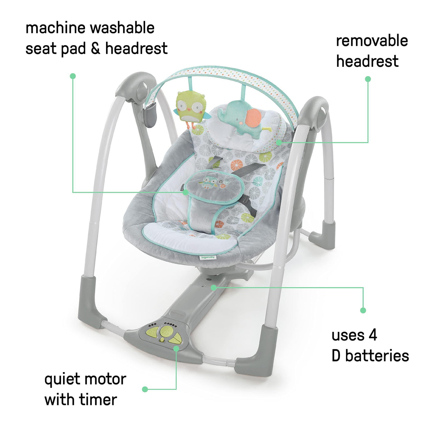 Details: When you have places to go, the Ingenuity Swing 'n Go Portable Swing is along for the ride. The compact frame is easy to transport, with all the same features you’d expect from a full-sized swing. Your baby can enjoy automatic swinging motions, listening to soothing nature sounds and melodies, and reaching for the 2 plush hanging toys – a sweet owl and elephant. Powered by 4 D batteries (not included), the swing’s innovative Hybridrive technology saves on batteries so baby enjoys longer swing times. You don’t have to sacrifice function with this mini swing. The 5-point harness and non-slip feet help ensure your baby’s safety, and comfort is in full swing with the ultra soft seat pad. The swing speeds adapt to your growing baby with weight-sensing technology, and the extra head support can be removed when baby outgrows it. With a gender neutral design, this swing makes a great baby shower gift idea for boy or girl. Your baby’s happy place can be any place with this on-the-go swing.