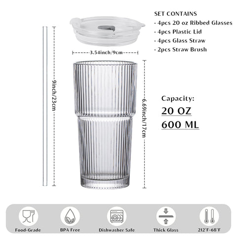 - Complete Set for Every Need: This all-inclusive set comes with 4 beautifully ribbed tumblers, 4 secure plastic lids, 4 sturdy glass straws, and 2 straw cleaning brushes. It’s everything you need to enjoy a premium drinking experience, whether at home or on the go.