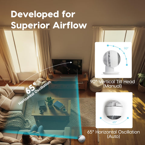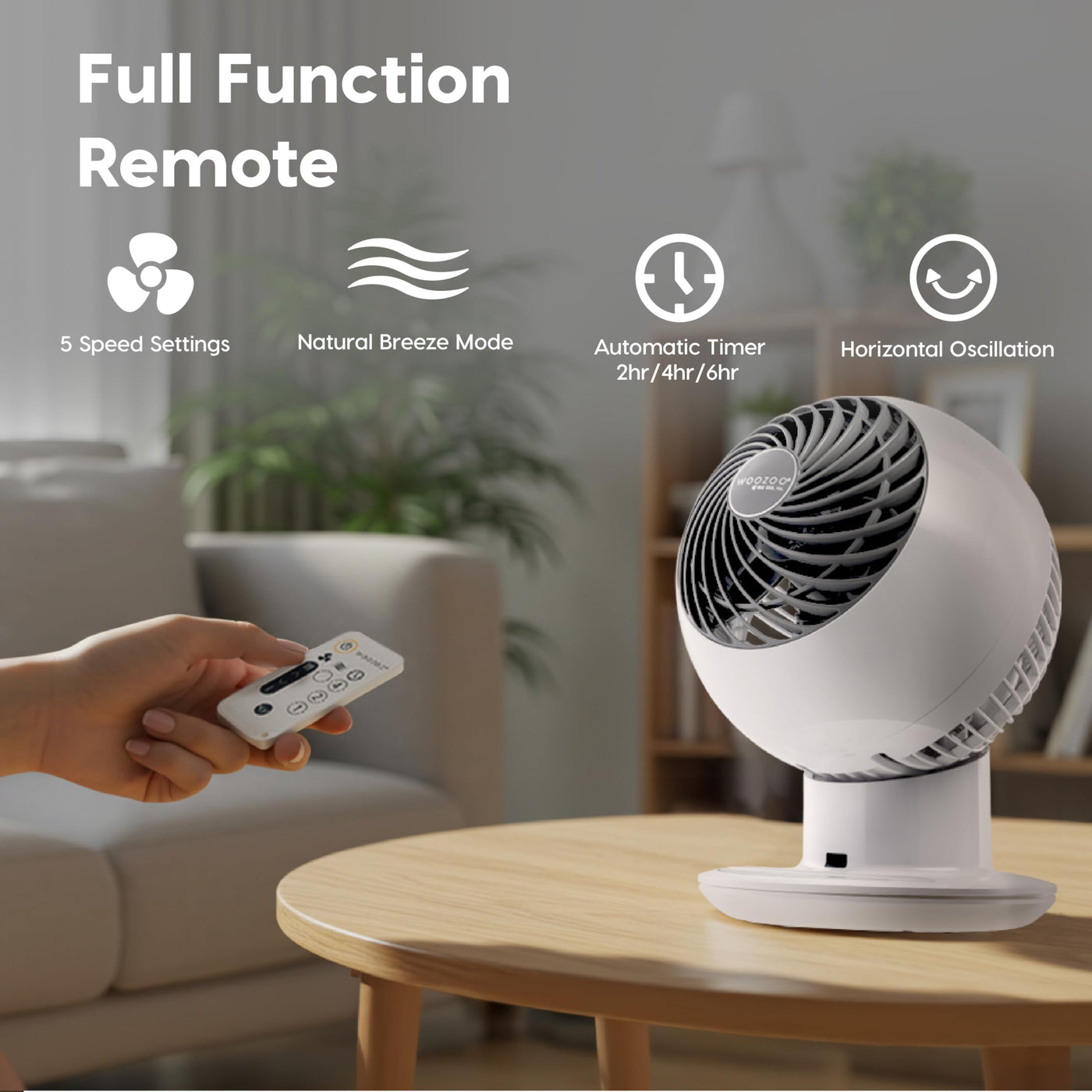 - OSCILLATION – Achieve full room auto air circulation like never before with WOOZOO oscillation. Set the fan to oscillate 65° to the left and right to ensure airflow reaches every corner of the room, and adjust the head to one of six set angles.
