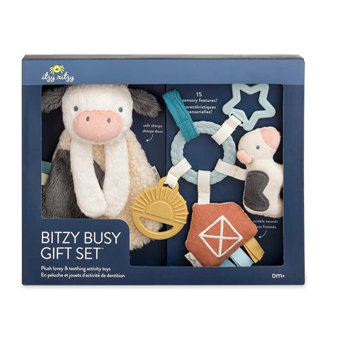 Details: Love is in the details with our Bitzy Busy Gift Set! Featuring our cow stuffed animal lovey and Busy Ring, this gift set is a sensory sensation. Snuggle up with the ultra-soft cow lovey for babies, designed to comfort your baby with its soft sherpa fabric and gentle crinkle sounds. The Busy Ring, with its crinkle texture, gentle jingle, and two soft teethers, easily attaches to a car seat or stroller for endless adventures. Perfect as a stocking stuffer or a thoughtful newborn gift and baby shower gift, this set is ideal for new parents or for celebrating any special occasion. Each item in the set is designed to captivate and comfort, making it a cherished addition to your baby plush toy collection and your baby's early experiences.