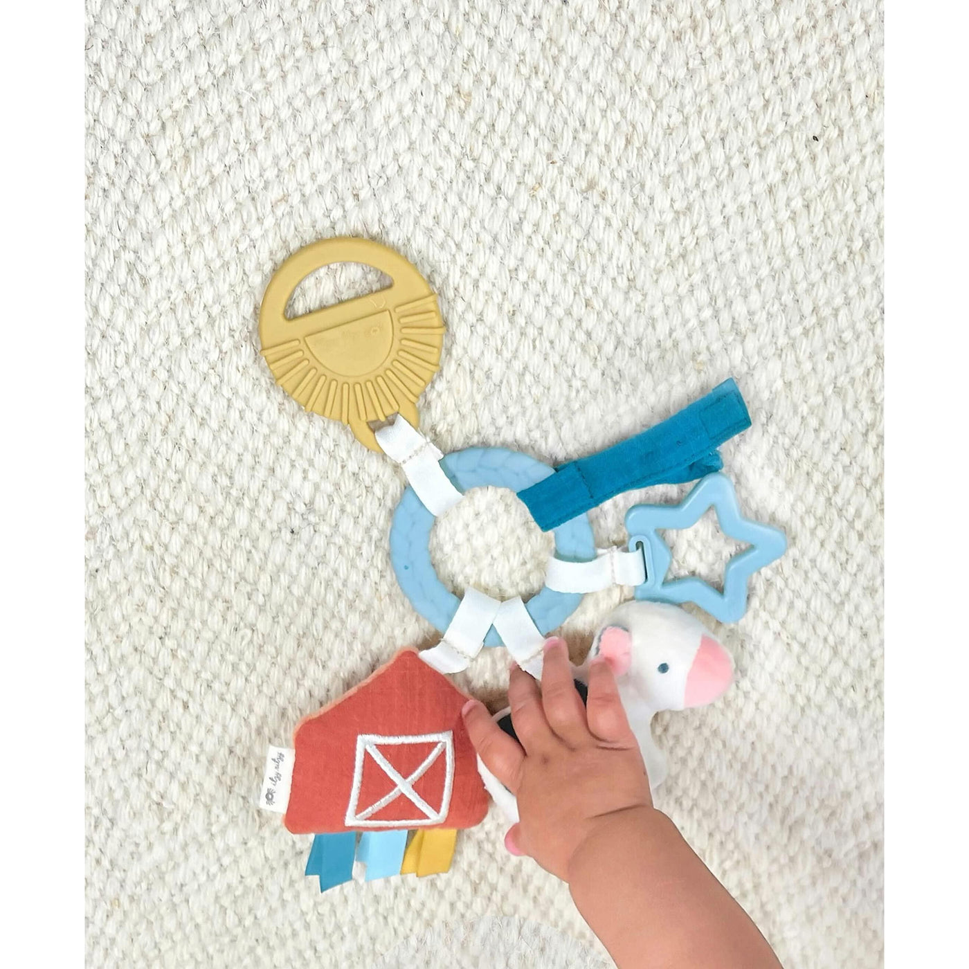 - MULTI-SENSORY PLAYTIME: The busy ring enhances your baby's playtime with its crinkle sound, gentle jingle, and soft teethers. This baby teething toy easily attaches to a car seat or stroller, providing on-the-go entertainment and teething pain relief.